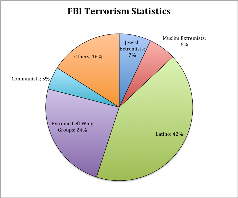 Okay, really? This is a topic that gets us into the most intense arguments with those on the right. We absolutely do not condone terrorism, for one thing, and the fact that anyone can imply that based off of our beliefs when it comes to Homeland Security is just awful. Here's the thing: Terrorists do not fit a profile! Terrorism is an act, and any person that can commit that act is then a terrorist. It is not a race of people. It is not a religious sect. It is an act of terror. Here is a pie chart of recently updated terrorism statistics from the FBI: