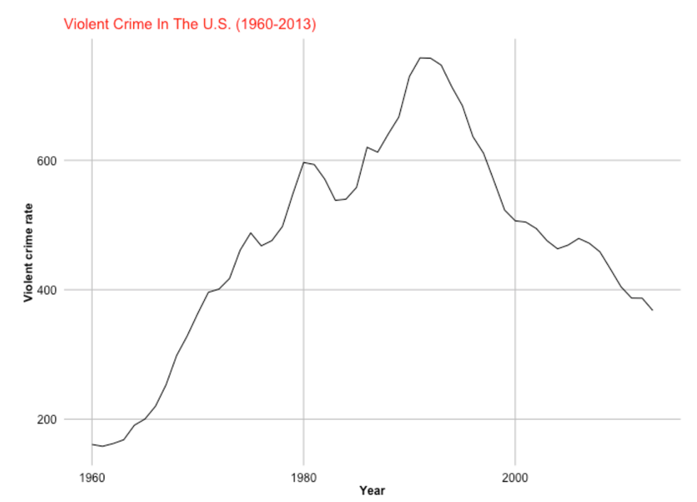 As you can see, violent crime has skyrocketed since 1960, to its peak in 1991, but has been on a steady decline since 1991. As of 2013, violent crime was at its lowest point in nearly 40 years, since the early '70s