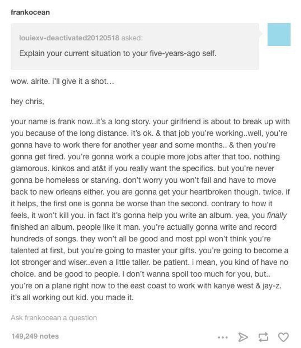 Until something jumped out at me. It was a retweet of a screenshot of an old Tumblr post by Frank Ocean. One of Frank’s fans asked, “explain your current situation to your five-years-ago self.”
