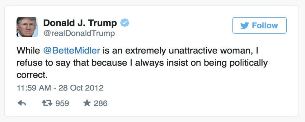 I think that it is due time that we discuss why you are choosing to vote for Trump. I mean, there has to be a justified reason why you would choose to vote for a guy who has time and time again proved his misogynistic views. Possibly you're unaware of all of his sexist comments. In an article by the Huffington Post titled "18 Real Things Donald Trump Has Actually Said About Women," we're given a great insight into his thoughts on women. He has been quoted calling a lawyer "disgusting" for asking to be excused to pump breast milk for her child. "All of the women on 'The Apprentice' flirted with me -- consciously or unconsciously. That's to be expected," Trump said. He even tweeted this contradiction,