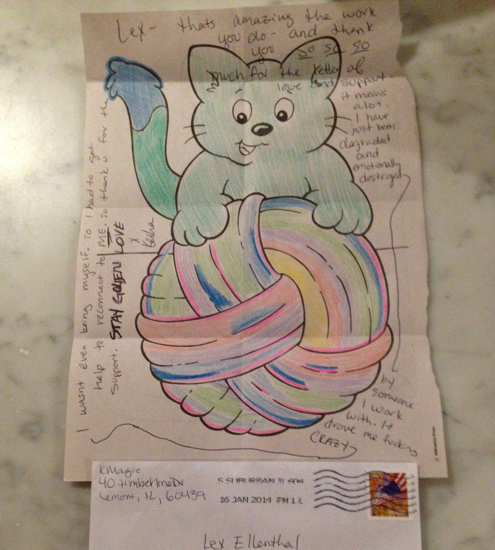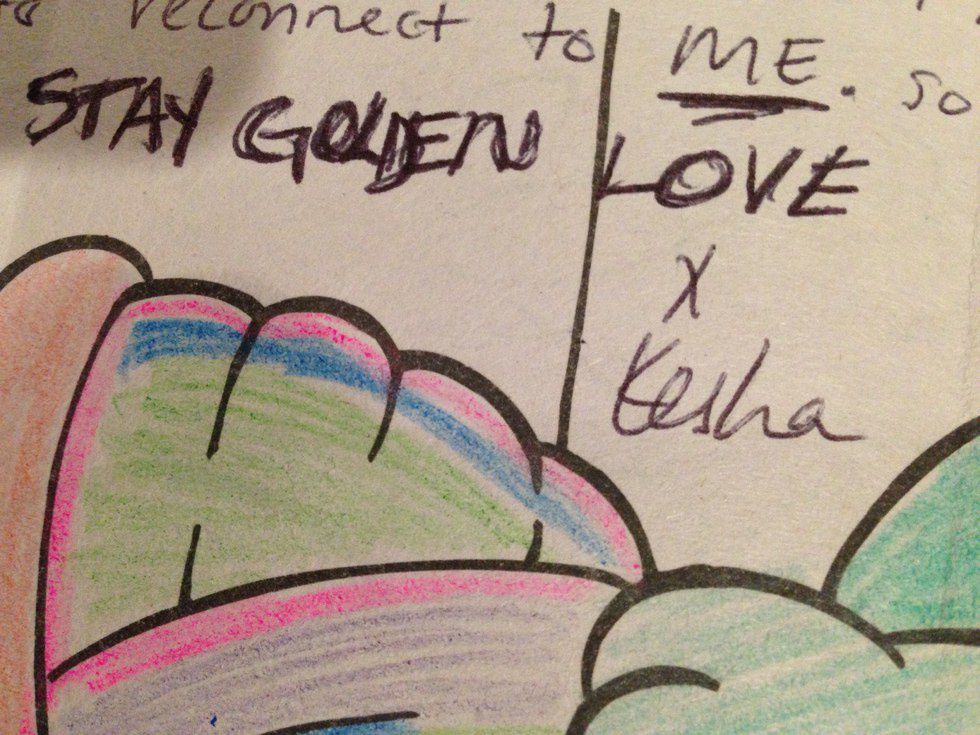 She was being treated for an eating disorder at an inpatient program called Timberline Knolls in the Chicago area. I was uncharacteristically upset upon learning that one of my favorite musicians was struggling. More than that, I felt connected to Kesha, and was compelled to express my support for her. I wrote her a letter, looked up the address of the Timberline Knolls treatment center, and sent it. Incredibly, she wrote me back. Her reply was very casual. It was on a page that she seemed to have ripped from a coloring book, with the words written around the picture she'd colored of a kitten.