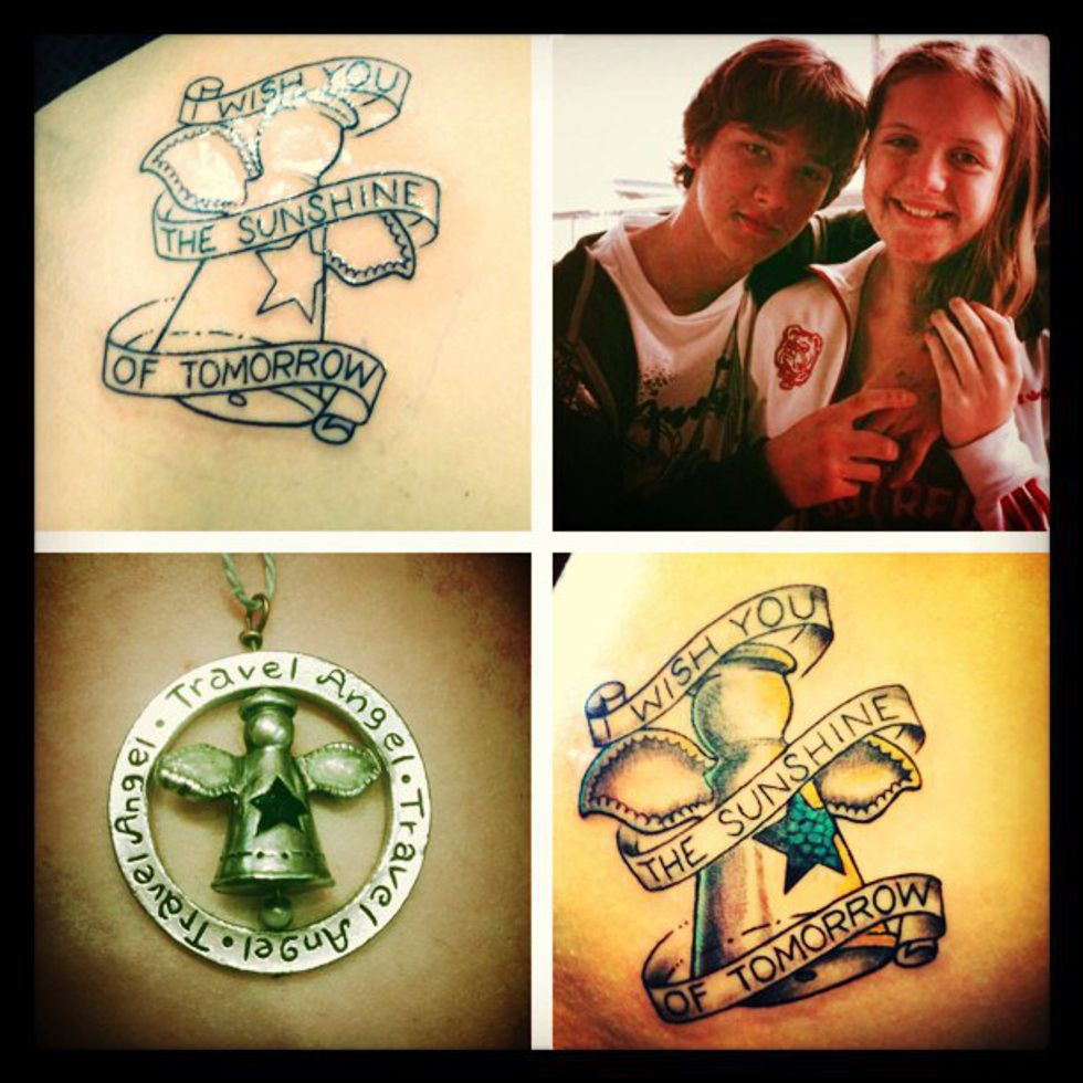 I remember all of our dates to the mall where we wouldn't even shop. We would just walk around, and laugh, and talk for hours. I remember all the time we spent at the park and when you would play your guitar for me. I remember how you always had your camera, and I would get so mad when you would constantly take pictures of me. I loved every second we were together, and It was cut too short when you left the Earth. I remember how angry I was at you three days before you died, and by the time I was ready to forgive you, you were already gone. It took me a long time to get over that, and for me to not blame myself for your passing. I started to wear an angel necklace for you and when I turned 18, I decided to make it my first tattoo.