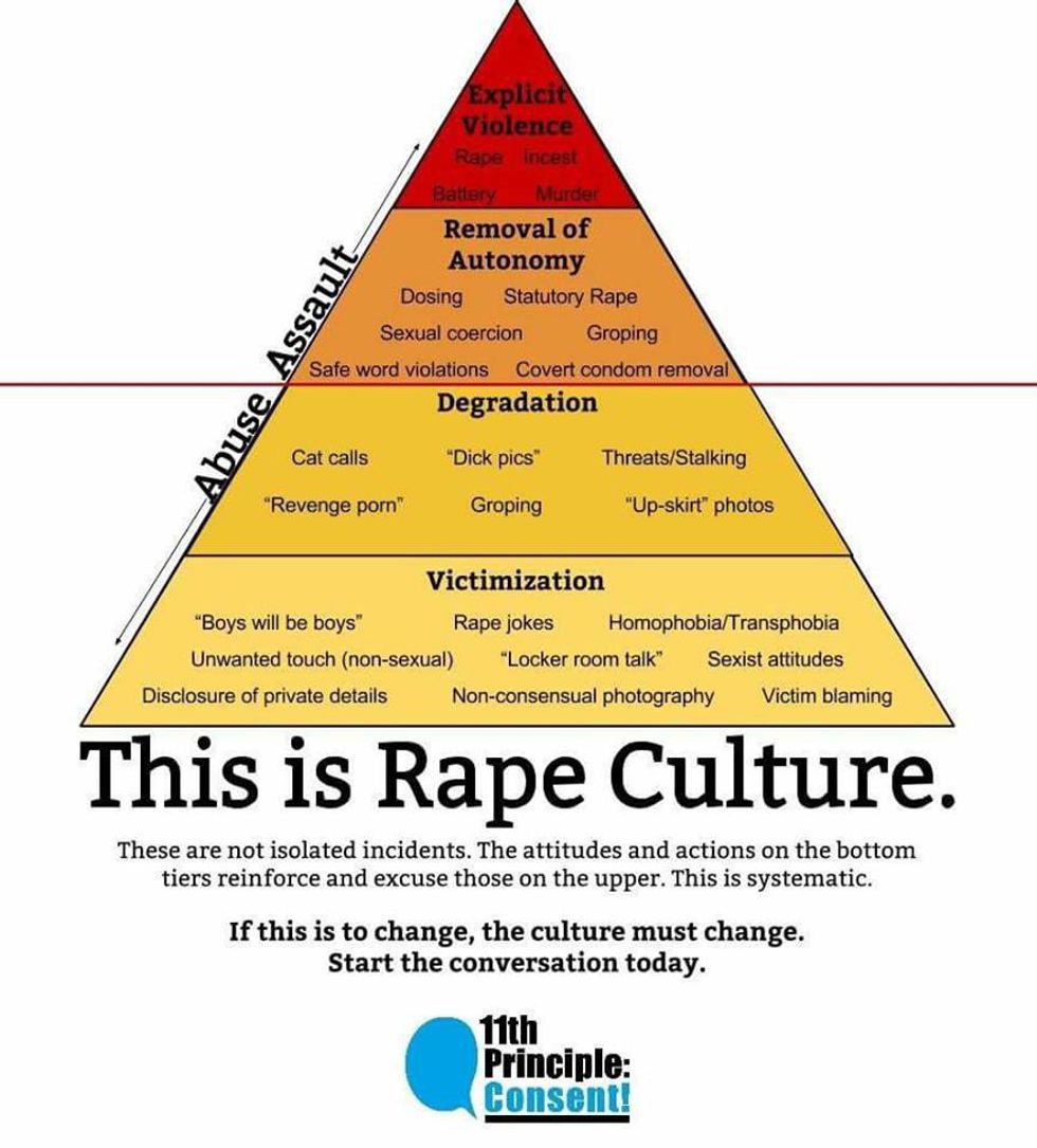 Not to mention he's called women fat, pigs, slobs, and disgusting animals. I can't emphasize enough how important it is that you all take it upon yourselves to not support the type of rhetoric Trump uses. That's the biggest hold-up Hillary supporters have with you. That's what hurts them. A man who says those things was just elected. And I'm not telling you it was wrong of you to vote for him, but it is now up to you to help create a culture where these types of comments are not acceptable. In our country, rape culture is typically a taboo conversation. But think about how many times either you or a friend casually did something in one of the bottom two tiers on that pyramid. It doesn't make you a rapist and it's not your fault that someone else commits rape. But you can make a world of difference if you refuse to condone that type of behavior. Right now, Hillary supporters are convinced that rape culture just got significantly worse, and nothing could be more horrifying. This is the reason these images exist: