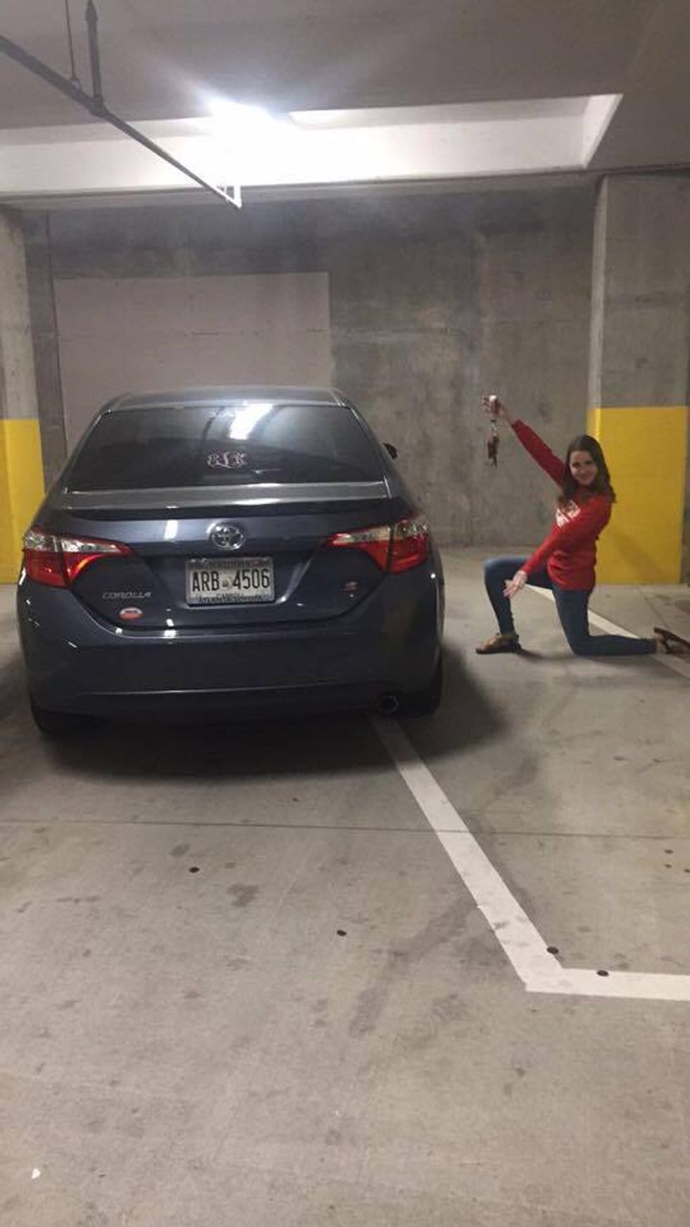 We have gone to Starbucks together three times (at the time that this article was written). The first was when I first officially met you. I knew you were trustworthy because you were wearing a Little Mermaid T-Shirt. We went shopping for dorm things (including the CUTEST pillow that says "Dorm Sweet Dorm") and color-coordinated everything. It was PERFECT. Then it rained a whole lot, and I left my sunglasses in your car until August. It was a wonderful day. The second time was in Athens, before we went to see the movie "Nerve." We took Snapchat videos in the car and talked about fish (spoiler alert). We got the same drink, but mine was hot and yours was cold. Classic. The third time, is my personal favorite. I was sitting on the floor, studying, and you came in the room and said, "I wish we could get Starbuck's delivered," To which, I replied, "Man, I could go for some Starbucks right now." The next thing I knew, you were making fun of how I parked in the Tate deck (pictured below), and we were having a grand time.