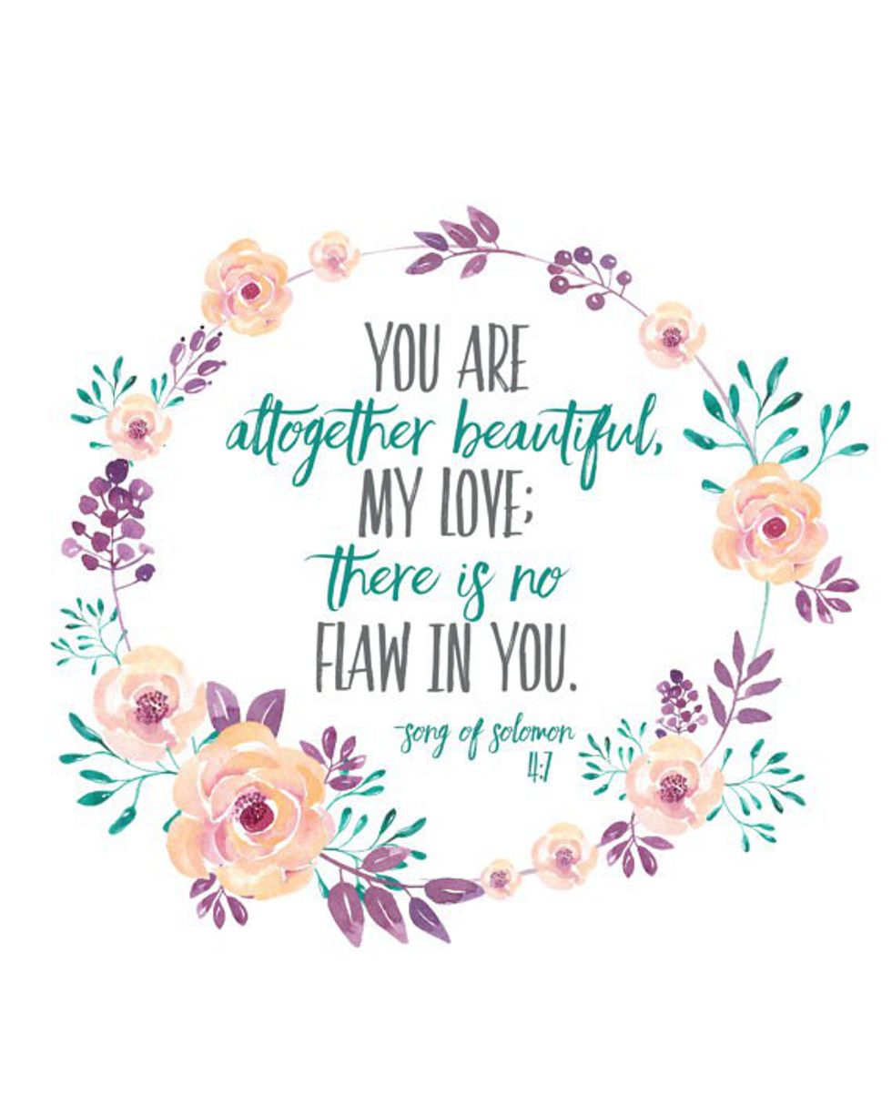 “You are altogether beautiful, my darling; there is no flaw in you.” – Song of Solomon 4:7 …I mean shoot, if God thinks you’re that beautiful can you really fight against it? God made you exactly how He wanted you. He made you exactly who you are supposed to be at this very moment, and He loves you from head to toe.