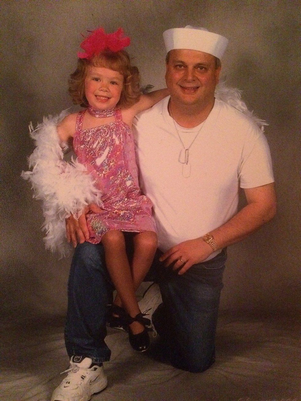One of my fondest memories of you and I is our daddy-daughter dance routine. I started lessons at MAJK when I was 5, and the 5 & 6's class did routines with our parents. This year, the dads were the lucky chosen ones. You graciously went to every practice and had fun, and you were a pretty great dancer too. I'll never forget dancing onstage with you to a medley of songs from "South Pacific", me in my pink dress and big boa, washing that man right out of my hair. You were the coolest sailor up there, and I'll always remember standing on top of your tennis shoes and dancing while the crowd of parents ate it up.