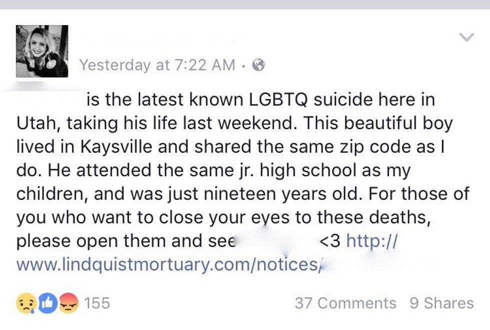 This is to say that yes, I lived in Utah. In fact, I lived in Senate District 16, the district you're running for. It's also to say that a youth suicide hits a tender spot in my heart. But this wasn't just any youth suicide in your state. This is someone from MY community. He was part of the LGBT community who also have a Mormon background. I am transgender and I finally accepted this for myself after my suicide attempt and started my transition. It's a small community, but it's a niche where I have found acceptance and pure love.