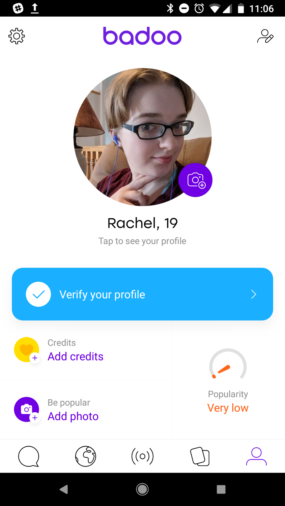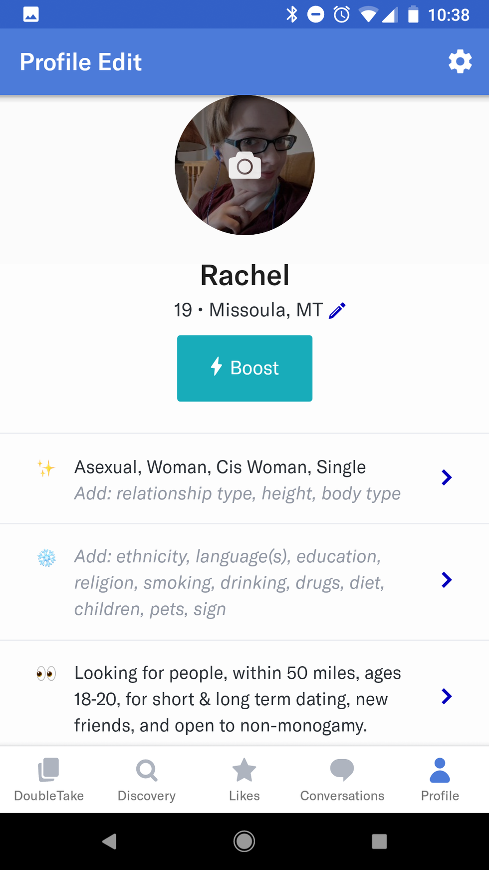 Badoo was not particularly inclusive. It did have a somewhat thorough questionnaire, which is always good, but other than that I wasn't impressed. For one, even when I identified as bisexual (the closest to my pan/biromantic asexuality I could get), I still had to go into the settings to enable finding women, which seems weird. Additionally, I could not ID as ace, and Badoo seemed very geared toward the desperate--it had a rating of how popular your profile was, continually reminded you that your profile wasn't well-viewed, and insisted on upgrading. So overall it wasn't the worst, it gave me more info than Tinder, but it wasn't the best either.