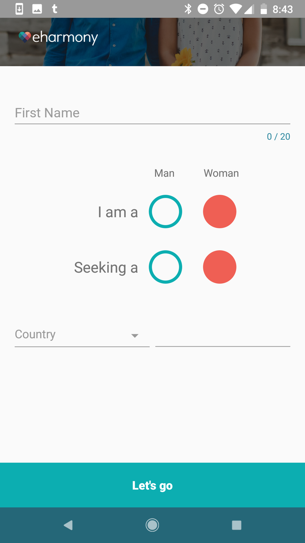 This was as far as I got on eHarmony. I actually learned that it doesn't allow same-sex relationships. In fact, if you want a same-sex relationship, you have to go on an entirely different site done by them, which is more than a little weird. Why create a dating app just for same-sex relationships when you literally have a dating app that you could put the option on (and maybe be a little bi-inclusive?) It's a mystery to me.