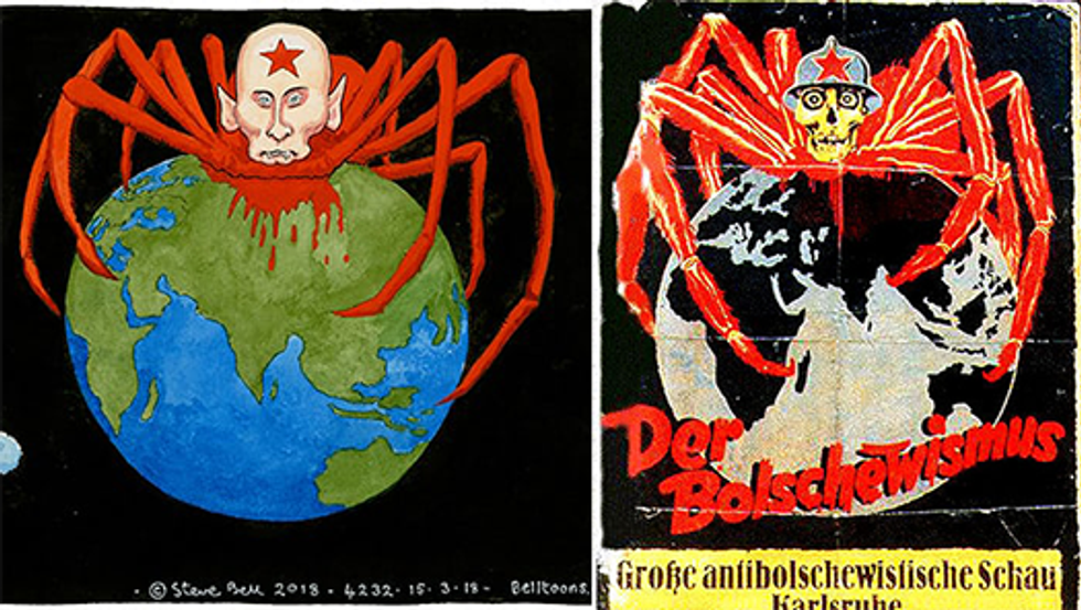 Left: cartoon by Steve Bell, 2018. Right: Nazi anti-Bolshevik propaganda, 1935.