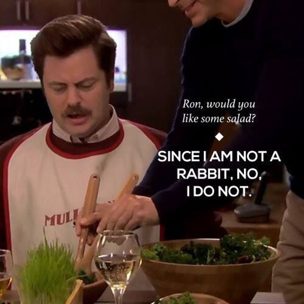 The only acceptable reason to ever eat a salad is if you are a woodland creature. Take Ron's advice, always go for the meat or the breakfast food.