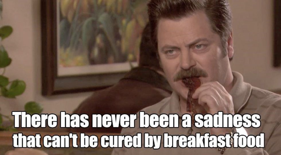 Bacon, eggs, and waffles -- is there really anything better in this world? No, therefore, any problem can be conquered by starting the day with a big breakfast.