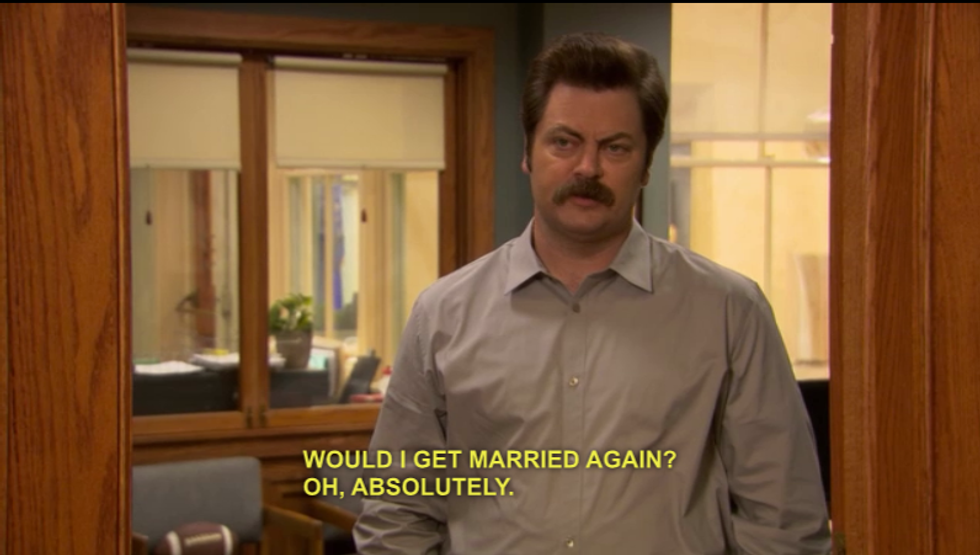 Two-time divorcee Ron Swanson is still up for the idea of marriage and gets married for a third time! Moral of the story -- don't ever give up on finding a relationship or finding someone special to spend your life with.