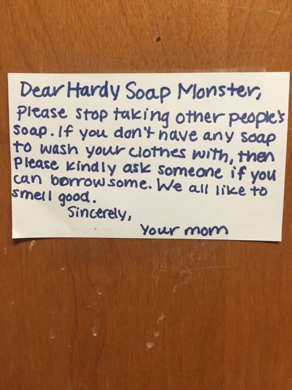 Con: The laundry room. Hardy Hall is one of the two dorms that only has one laundry room. Guess where it's at: The basement. It's great if you live on basement. It's right there! Here's the thing: There's four washers and four dryers for the entire building. That's about 100 women trying to use the same washers and dryers all the time. Not to mention, if you don't live on basement, you have to travel down a flight of stairs or three with your laundry. People tend to put their stuff in the washers/dryers and forget about it, too, so you're stuck there waiting for someone to open up the washers so you can do yours. To top it all off, at the beginning of the year, there was the Hardy Hall Soap Monster. Someone was using everyone else's detergent/softener and it got really annoying. It got to the point where someone put a note on the laundry room door for the Hardy Hall Soap Monster.