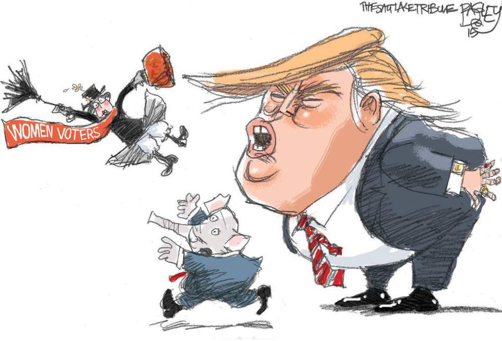 Despite his ridiculous claims that, "No one has more respect for women than I," Trump doesn't see any value in women, other than being a piece of ass he can touch in anyway he chooses. Given his lack of respect for a woman's mind and capability to exist successfully in the public sphere, who's to say he won't try to revoke the 19th Amendment, taking away women's right to vote? After all, with Trump, anything horrifying is possible. I mean do we really want the next Hugh Hefner sitting in the oval office?