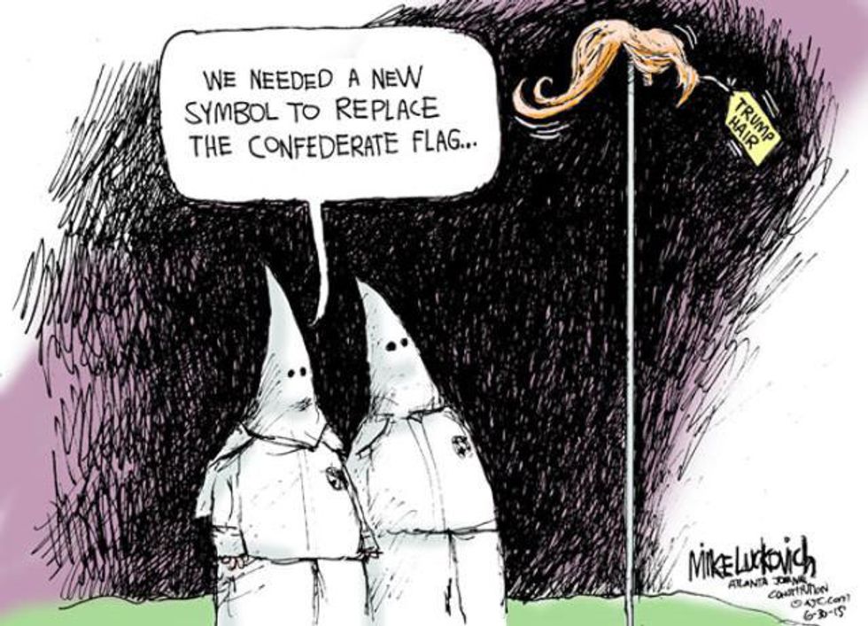 Trump's presence is literally a breeding ground for White Supremacists who believe they are better than everyone else, that every "other" must be removed before they infiltrate the "American" way of life. While other races, ethnicities, sexualities, genders and religions still face oppression, cruelty and marginalization, we should be moving forward to remove such injustice, not regressing back to barbaric ways of violence, murder, lynching and rape. Will we allow the new KKK mascot be our next president?
