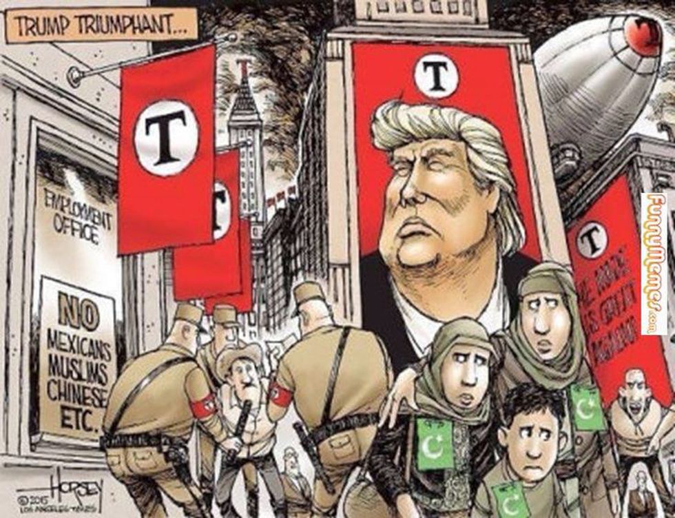The installation of Trump as president will be our allowance for the next Hitler to exist in the United States. For just as Hitler saw the Jewish as a threat to "purity," Trump holds the same mentality for Muslims. Islam is one of, if not the most, peaceful religions out there, and it is wrong for us to clump all Muslims together because of the wrongs done by a few extremists. For every religion, every group, has extremists that exert inhumane violence, but that does not mean we have the right to oppress all those who hold the same identifiers, especially ones that differ from being white, Christian, heterosexual, cisgender males. Will we let Trump, a white extremist, have the power to condemn the innocent as threats that must be obliterated?