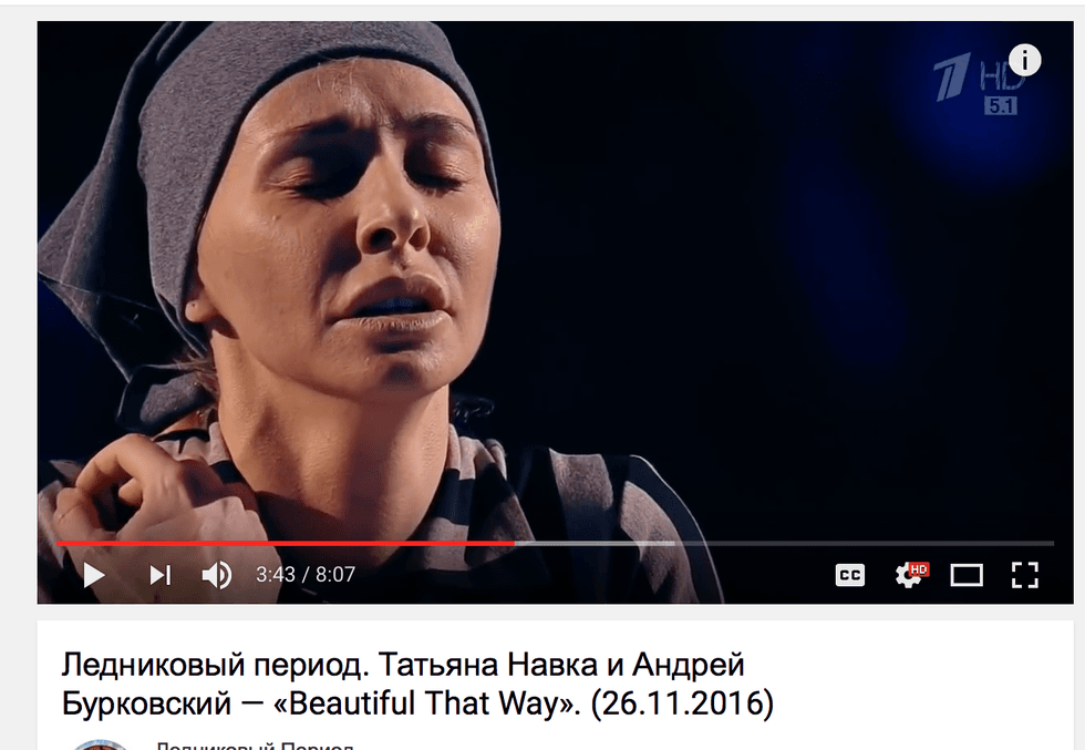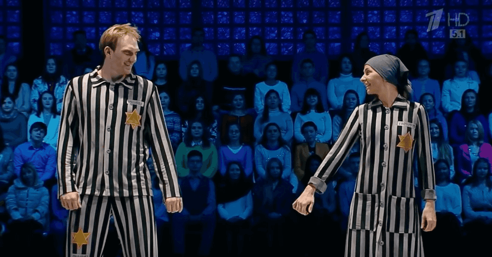 Renowned Russian ice skaters Tatiana Navka and Andrew Burkovsjy, dawning prison uniforms and the yellow stars of David, masterfully glide and leap to Acinoam NiNi's rendition of "Beautiful This Way." This song, which is performed by a Jewish artist, is famous for its presence in the 1997 film "Life Is Beautiful."