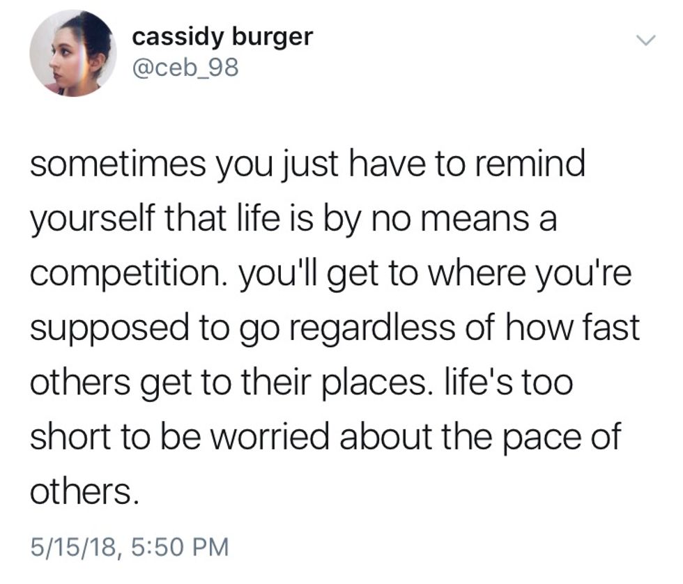 It's taken me some years to realize it, but life is not a race. If it was we'd all be a lot more exhausted then we already are. Years from now I don't want to remember myself in college freaking out about my future but want to remember all of the great times I had with the people I love.