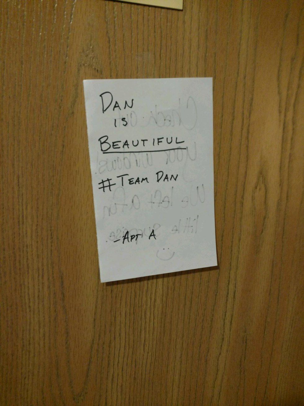Dan is this head. The neighbors below us have him in the window. He is super creepy. Them and ourselves enjoy sending passive aggressive notes to each other. Here is their note. It is all in good fun, but the face is still creepy.