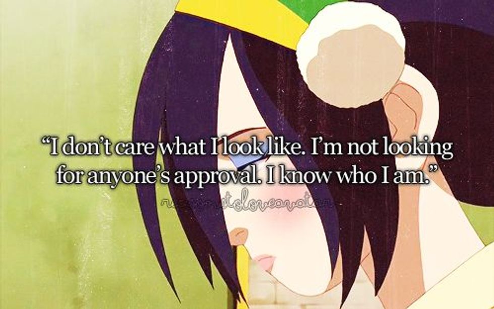 Like Smellerbee, Toph is comfortable with who she is. She knows who she is, and likes it and owns up to it. She doesn't seek validation from anyone. She validates herself. We need to accept ourselves like Toph does. We don't need to look for validation or approval from anyone else.