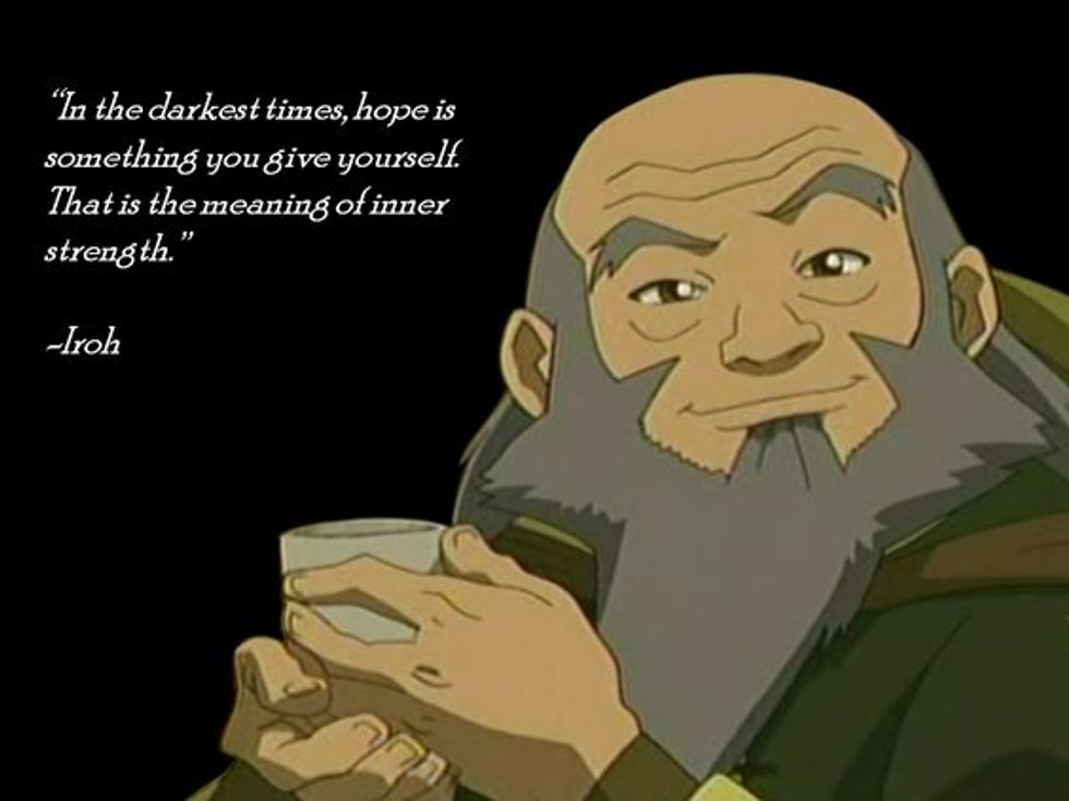 Iroh is obviously the wisest of all the characters. His quotes are the best, and most heartfelt. When we feel at our worst and have the darkest of days, we need to understand that we are their for ourselves. We can find hope within ourselves, we can keep going because we believe in ourselves.