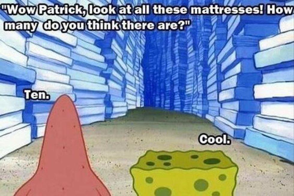 There's definitely more than 10 mattresses there, but they've got the idea.