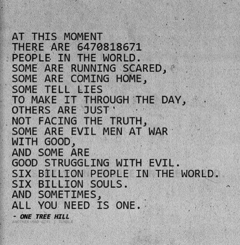 If I had to pick one television series that has been the most influential on my life, I would choose "One Tree Hill." "One Tree Hill" had a way of embodying its audience, making them feel like they are a part of the "gang." I felt happiness in my heart when Nathan and Haley got married, sadness when Keith was killed, and excitement they won the state championship. I felt like I truly went through high school and all the life experiences they endured. I have found that a lot of advice and things the characters have said are relatable.