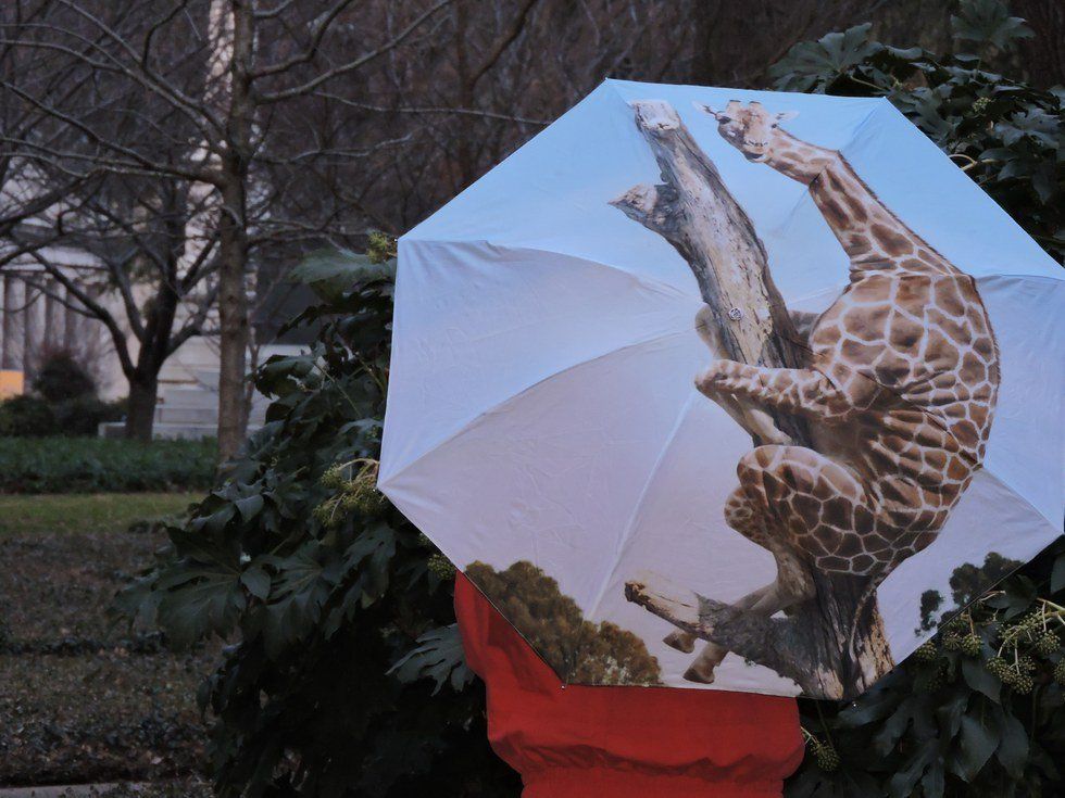 I often find myself walking along our brick pathways as the rain pours down with my giraffe umbrella held high, wading through a sea of people carrying plain, black umbrellas. I can also see the occasional cute polka-dot pattern here or there, but, for the most part, everyone seems content to blend in.