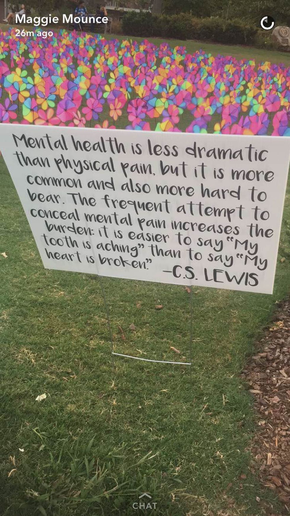 Dozens of paper bags illuminate the night. "John." "Logan." "Friend." "Daddy." Each bag contains a softly glowing tealight, and a name lovingly written on its exterior. UNCG students, faculty, and volunteers stand en masse, holding brightly gleaming candles that illuminate the night. Hundreds of colorful pinwheels whirl in the background- 1,100 of them, to be exact, one for every college student lost each year to suicide.