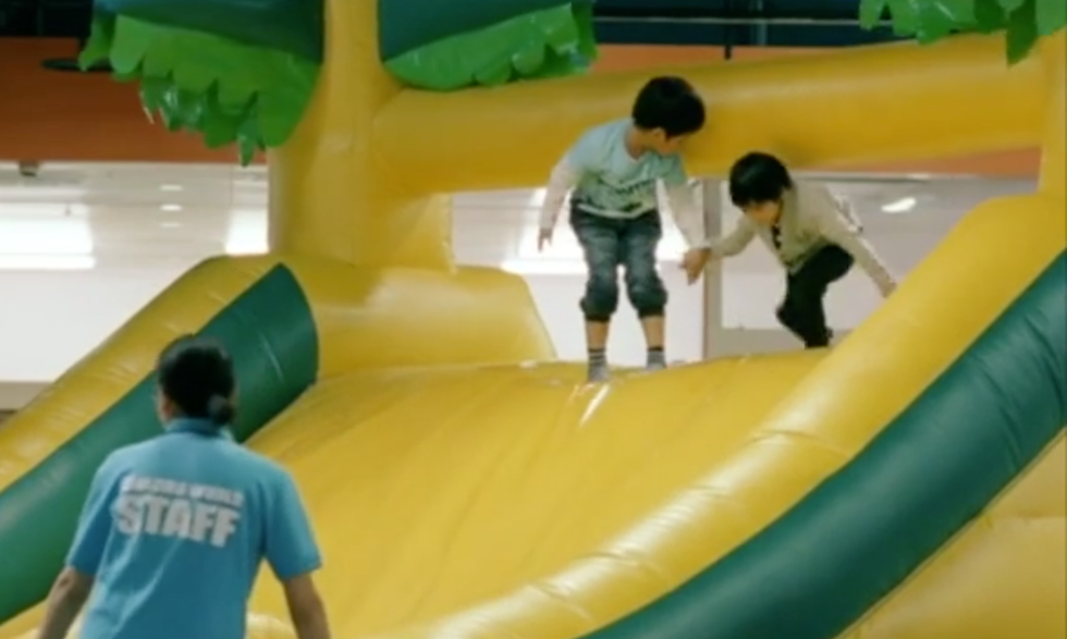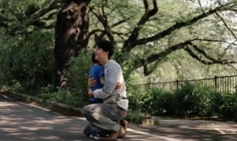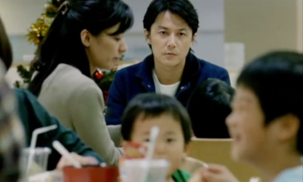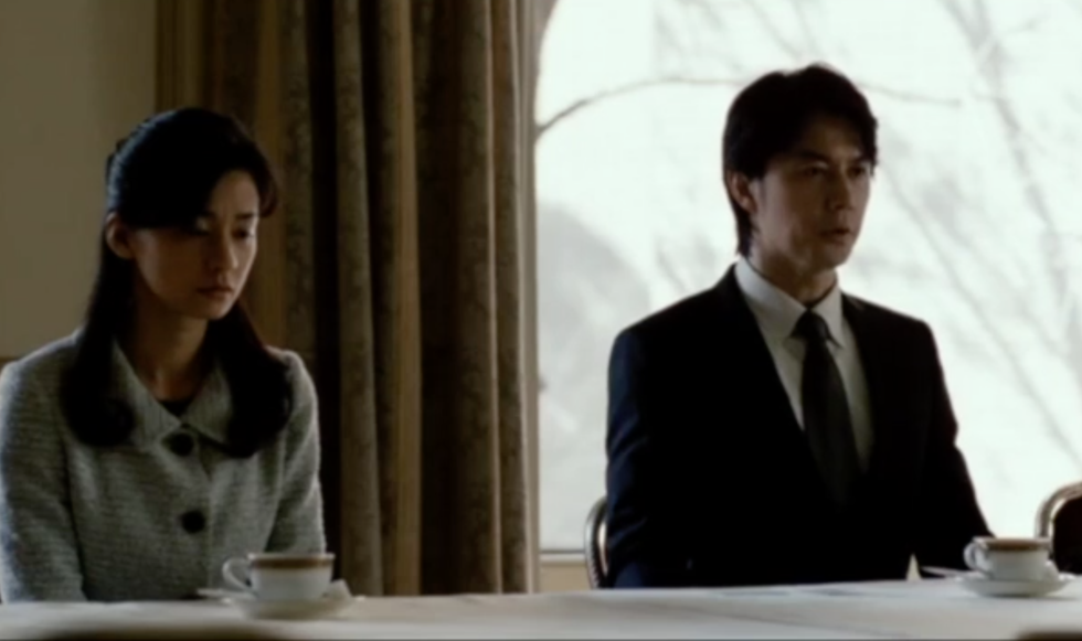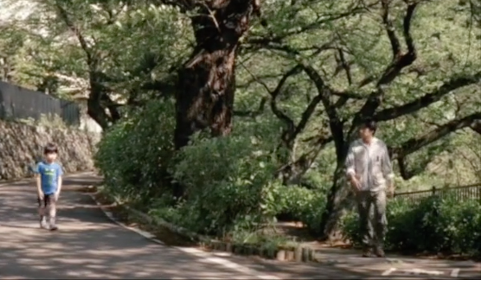This encounter is the instance where the boys meet for the first time. Ryusei invites Keita to play with him and holds his hand. This gesture symbolizes closeness between the two, even though the children are completely unaware of the situation between their families. Even the placement of the actors embodies the conflict. As the children leave their parents behind we see a long-shot where the Saiki family is on one side and the Nonomiya family is on the other. While they are in close proximity they are still separate and different.