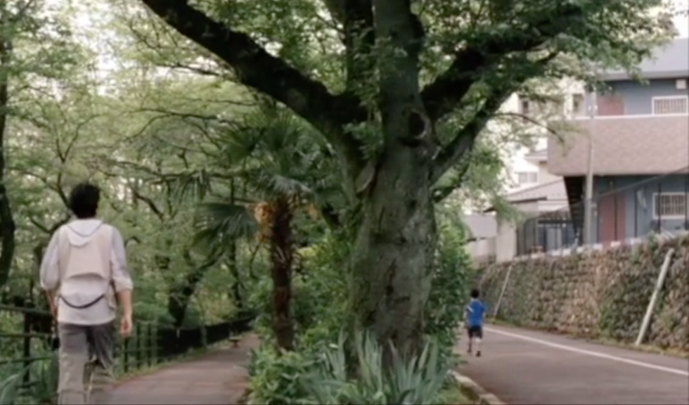 There is a lot of movement in this scene as the camera follows both Ryota and Keita side by side. The scene takes place in an open area surrounded by trees as well as man-made buildings. Vegetation is juxtaposed with human design. It serves as fitting backdrop to frame the complicated relationship between nature and nurture.