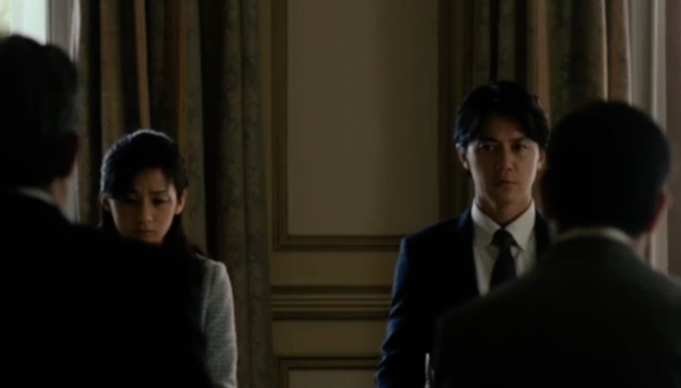 This scene is the high point in the story. It is where we see in mid shot the Nonomiya family across from the board of directors in the hospital. This is where they face the fact that Keita’s blood work does not match his parents’ DNA. At this bleakest of moments, the scene is washed in dull and dark colors demonstrating the somber environment and the gravity of the situation. In contrast to the silence there is the cacophony of a formal banquet in the background.