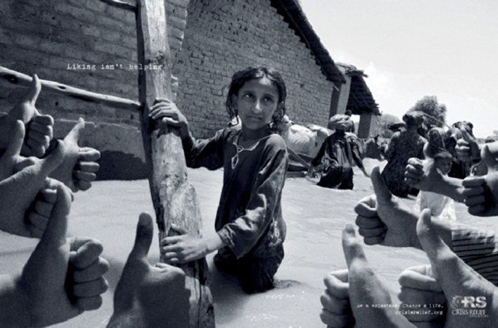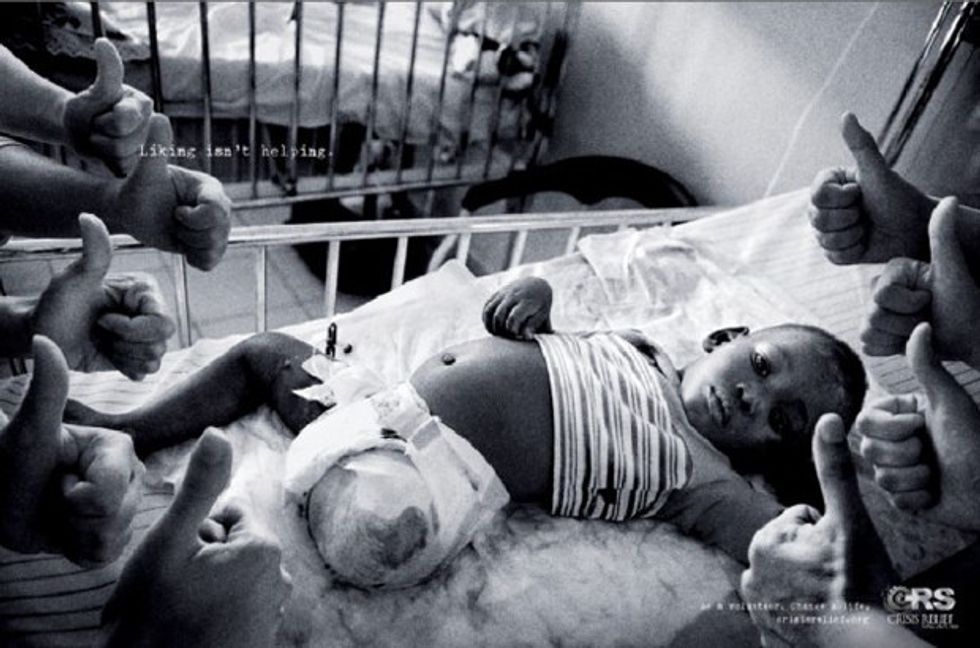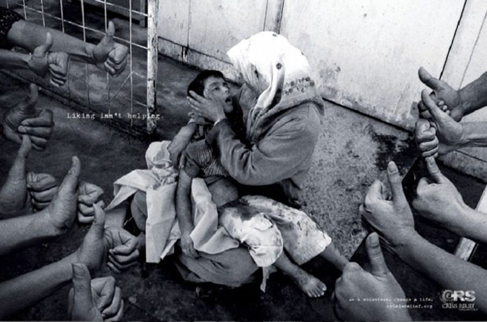 The "Liking Isn't Helping" campaign uses real, shocking press images of children in distress, then surrounds them with hands giving thumbs up. It really puts our "activism" in perspective.