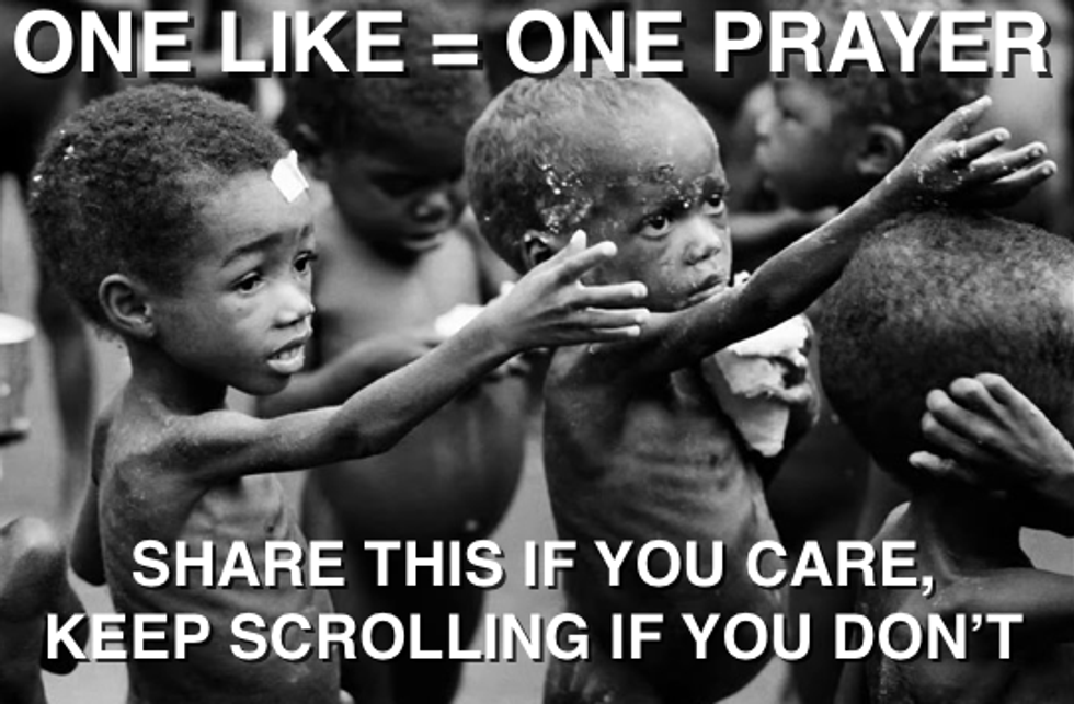 You know the posts I'm referring to. I call them "guilt trip posts." For instance, a photo of a starving child or an endangered elephant appears on your news feed with the message, "Like to help (insert human/animal rights issue here)."