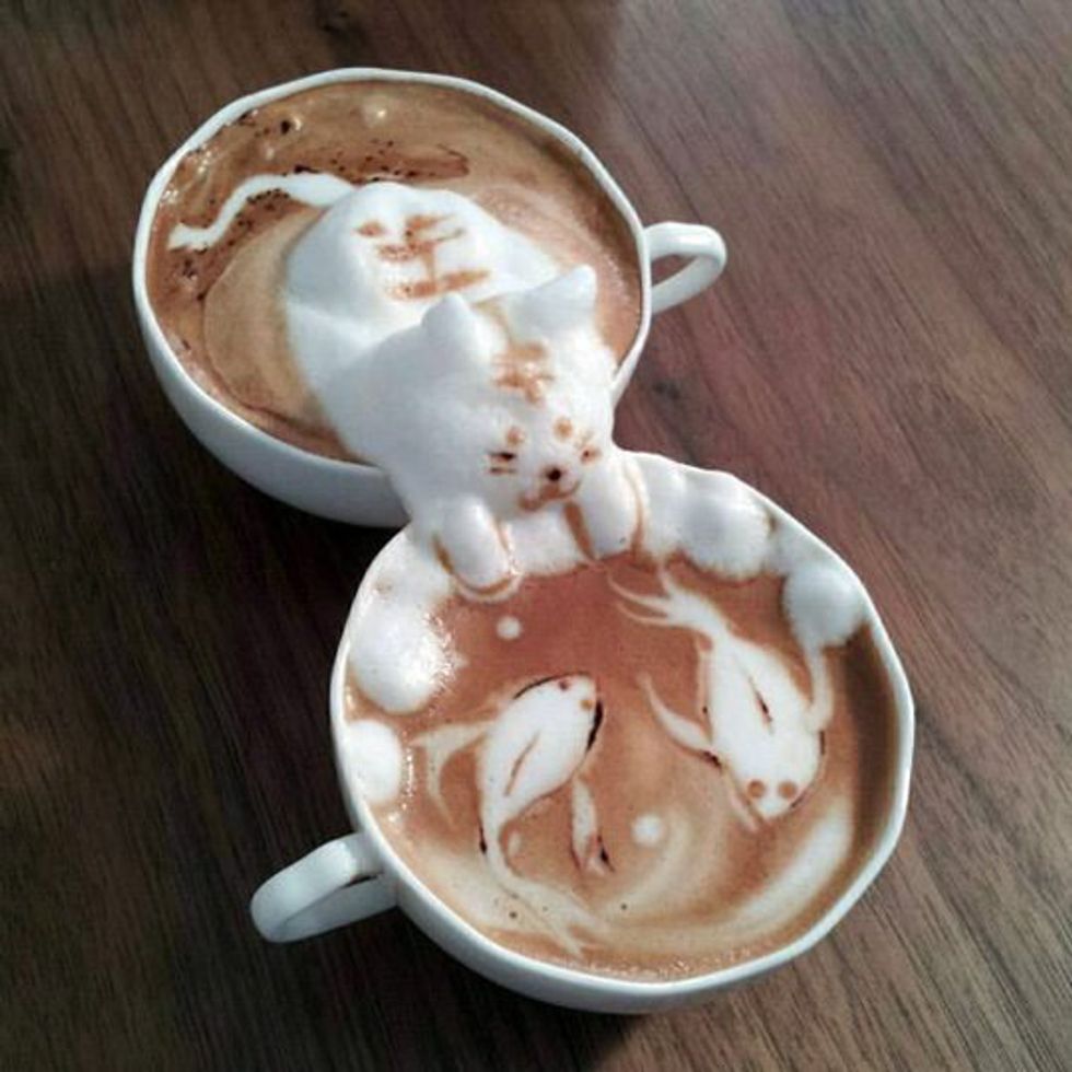 I found a fish latte! In my research on latte art I found how many creative designs people have come up with. It's truly an art form. I wish they would spice up the designs at my local coffee shop! I also discovered that latte art was invented at around the same time in Italy and America... independently! With the development of micro foam in Italy, the marriage of espresso crema and foam was made.