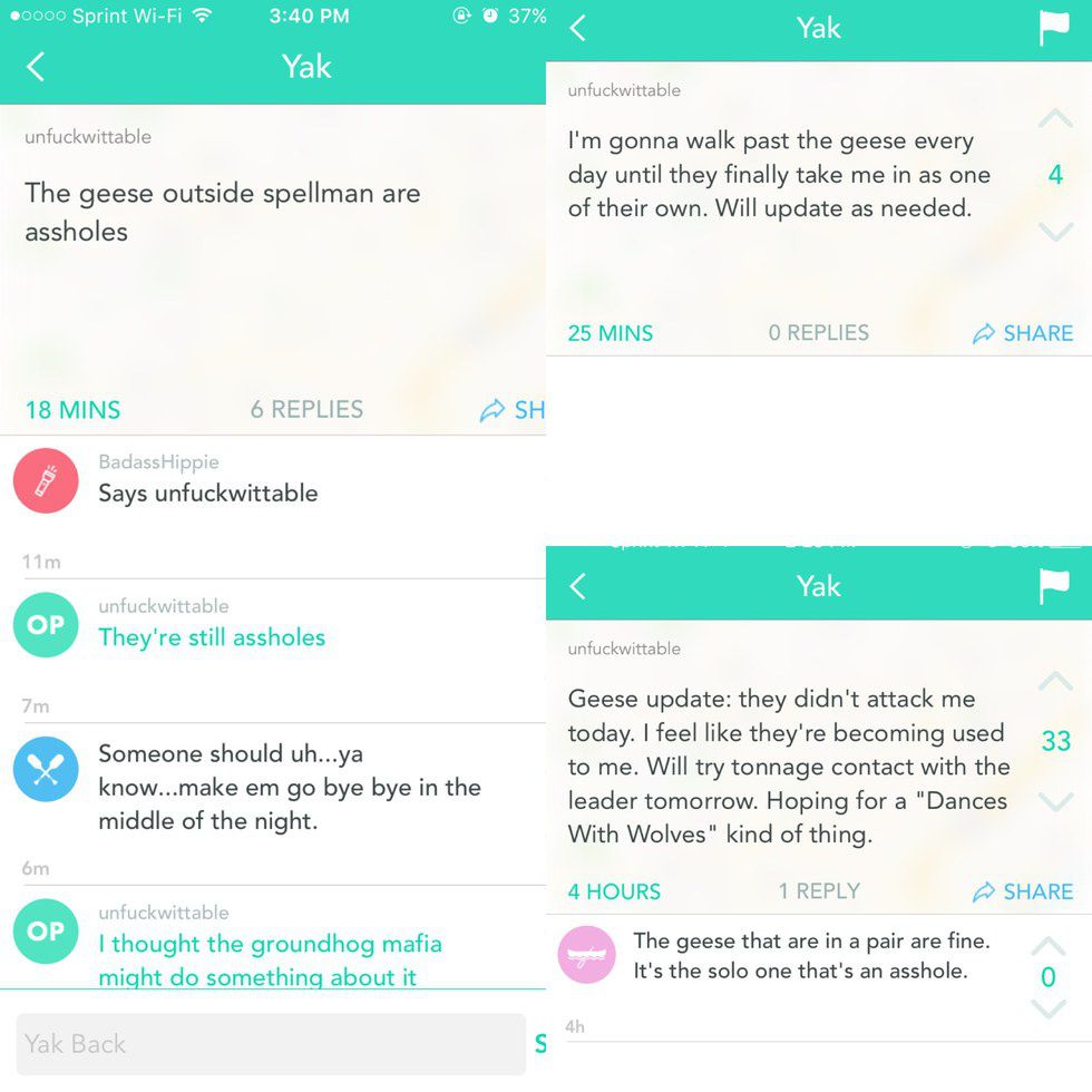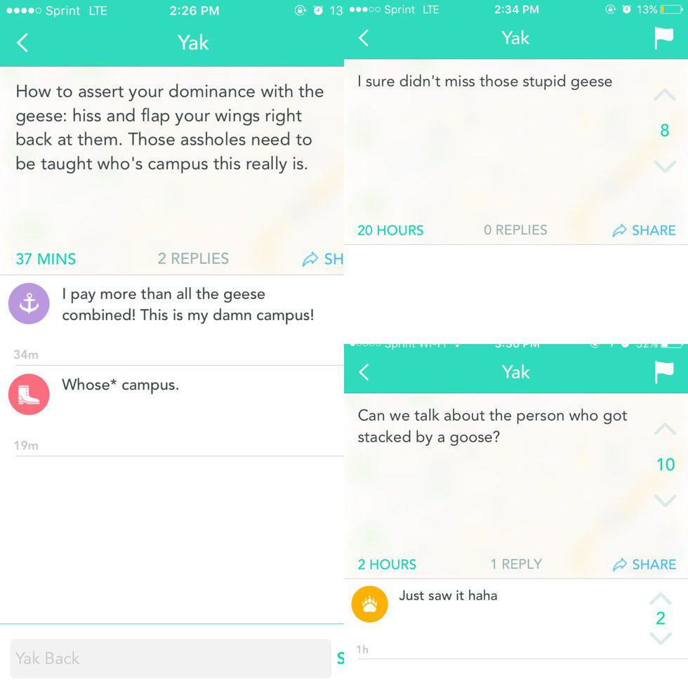 Until we are notified that the geese are open season (maybe in our dreams) the wise students of Lindenwood University will continue to protest on Yik Yak and through other social media. Over the past few weeks, numerous users online have "called out" the geese, and most commonly reference them as "assholes." One yakker who goes by the handle "unf*ckwittable" even provides almost daily updates on their situation between the geese. It started as hostile, but slowly said user was brainwashed by the idea of becoming "friends," with the enemy.
