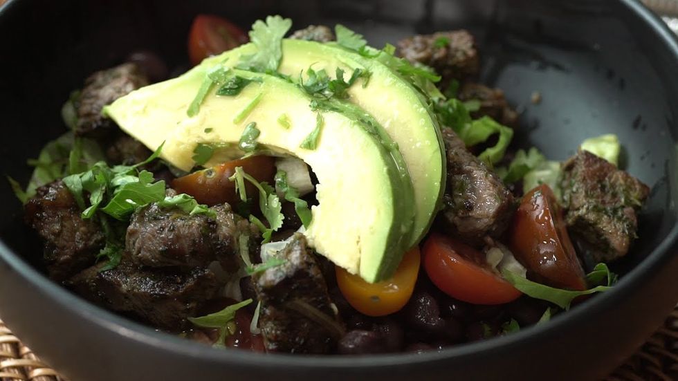 One of my newest and favorite meals of all time, you can definitely make this in bulk for seconds and thirds. This involved steak, a cup of brown rice, thinly sliced peppers, onions, half of an avocado, your choice of salsa, lemon juice, and a ~sprinkle~ of Mexican blend cheese. PSA: I'm literally tearing as I write about this beloved steak bowl because I've already gone through the first, second and third of its leftovers.
