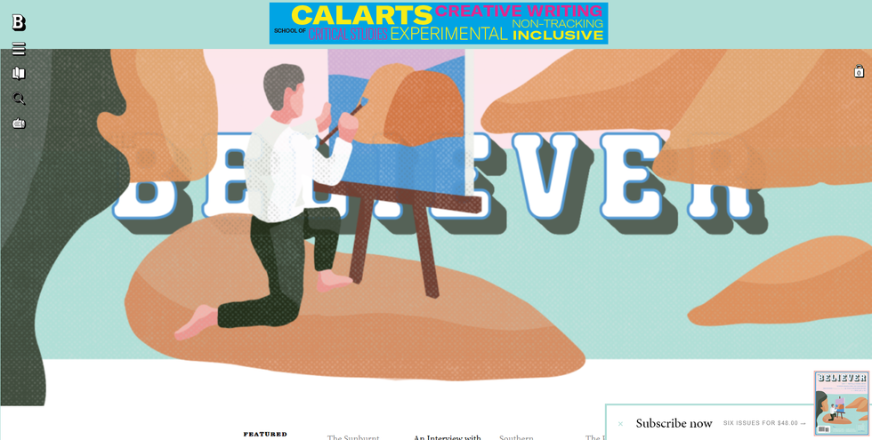 "The Believer" is a literary magazine that loves to publish works with certain demographics in mind. They come out with music and art editions of their magazines, allowing people of all preferences to enjoy the latest critique or interview of their favorite artist. I found it to be averagely accessible writing, nothing that caused me to use Google, but also nothing that caused me to put the lit mag down in hopes of a more sophisticated read. That is not to say that "The Believer" isn't for sophisticated readers--if someone is a fan of this magazine, they open it with the intention to learn and "The Believer" provides just that.