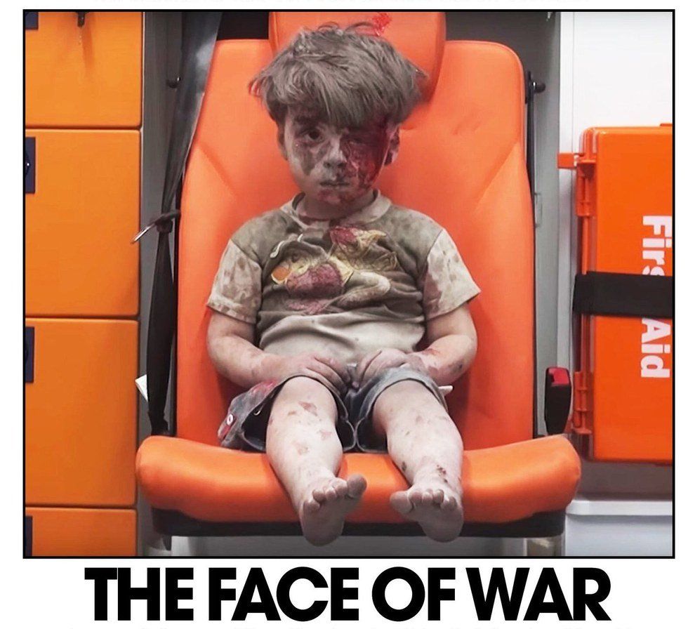 This is Omran Daqneesh of the city of Aleppo. He's 5-years-old, just a little more than a toddler. His house was destroyed in the night by a government airstrike. Miraculously, his family survived. But look at him. Just a child, and shell-shocked into stunned silence. He just sits there, looking about, probably wondering why this has happened.
