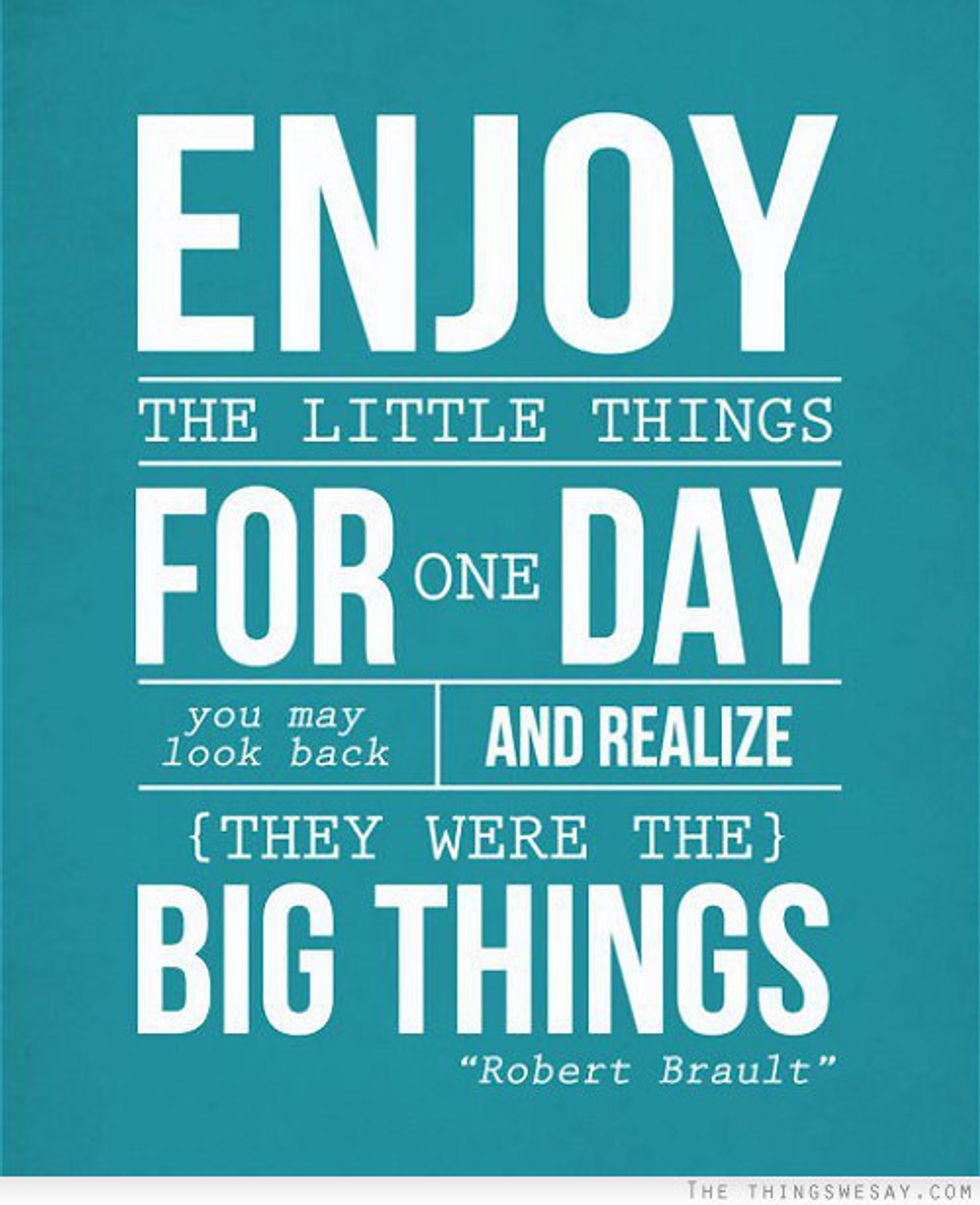 It is these little things that I have come to appreciate more and more. Whether that thing is something someone said or did that made you smile, or just a song that makes you happy, it is these things that can make or break a day. It is time to start noticing and appreciating these things, because guess what…life really isn’t that bad! For instance, how great is it when you wake up before your alarm goes off and realize you have more time to sleep? Or when you’re fast-fowarding the DVR and you stop just as the commercials end, and you’re just like, “Am I the great or am I great?” And don’t try to pretend that you’re not filled with joy when enough people “like” your Instagram photo that it turns from names to numbers. Or how about when you get in your car and turn on the radio and your favorite song is just starting? You know you can’t help but dance and sing in your car like no one is watching. What about when you put your hand in your pocket and discover that there's money in there and you suddenly feel rich, even if it is just a dollar? Or…Popping bubble wrap? Warm clothes out of the dryer? Receiving a cute text from your crush? Random dancing? Rapping a fast part of a song like a beast? Taking off your shoes when you get home? Freshly shaved legs? Getting out of work early? Perfect summer days? Those cute puppy pictures on twitter? Knowing all the words to a song? Reading a good book? The feeling you get after a great work out? Being with friends and family? And the list could go on and on….