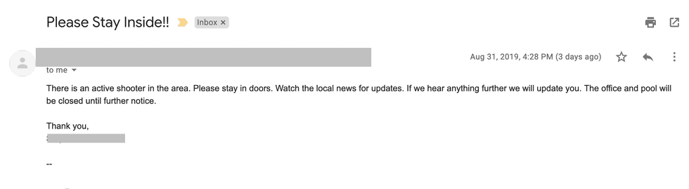 This weekend I was in Austin, TX for the holiday weekend. My boyfriend and I were waiting for our pizza to get to our table when he looked at his phone and froze. When he picked it up to show me, I read this email from our apartment complex: