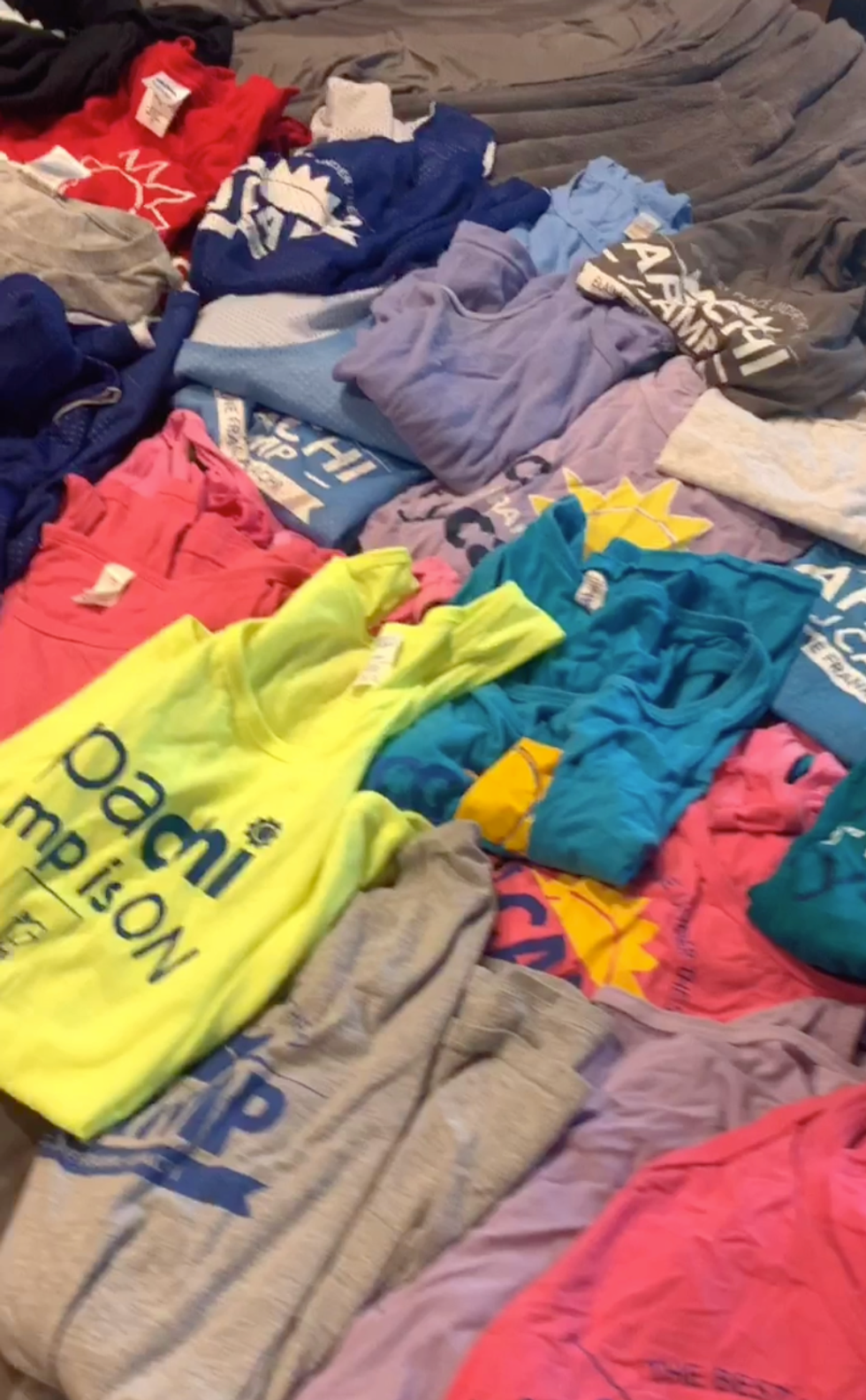 The picture still doesn't do it justice...three people and almost twenty-seven years of camp later you can only imagine how many camp clothes my family owns. T-shirts, tank tops, pullovers, bucket hats, mask chains--there is truly camp attire for every occasion and therefore I feel #blessed.