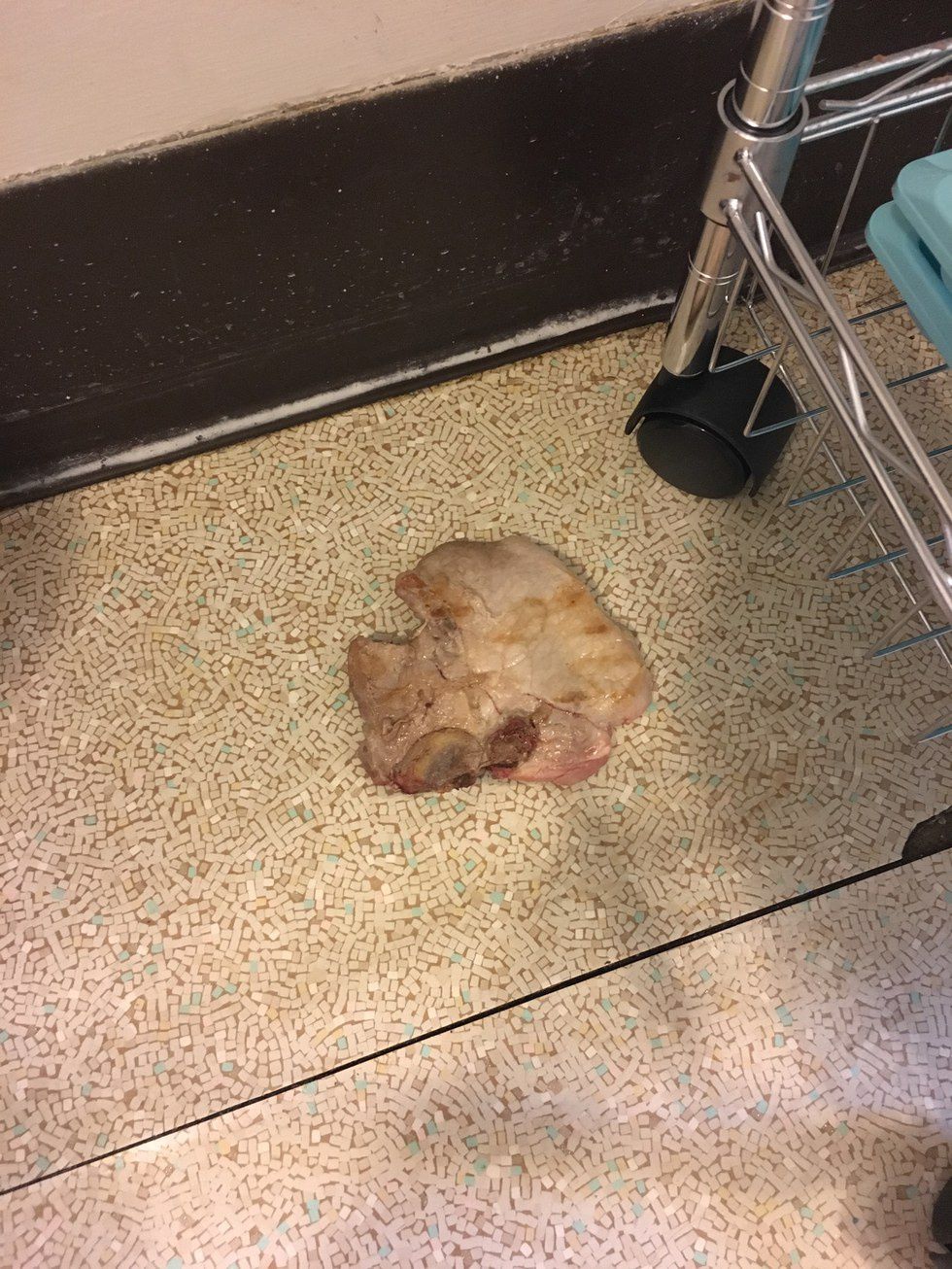 Being an adult is a lot of responsibility, however. Because it's Week of Welcome, there has been a lot of free food, so I have only cooked dinner for myself a few times this first week. The times I did cook were stressful because I had to figure out what I wanted to eat and how to cook it. I did well the first time; I made a chicken panini in my panini maker. I was really worried I would undercook the chicken but I did a pretty good job for never having cooked it before. My second attempt at cooking my own dinner didn't go as well as the first. I decided I would make a pork chop and green beans for myself. I put my green beans in the microwave and started grilling my pork on my panini maker. It was gong well at first but then when I tried flipping the pork, I pushed it right off the panini maker onto the dirty kitchen floor (pictured below). Then, because I was using both the panini maker and the microwave, the fuse in the kitchen went out (it does that when we use more than one plugged in kitchen appliance). So my pork chop sat out for almost an hour while we waited for physical plant to turn it back on. Needless to say, I finally threw away the pork chop and resorted to a BLT no T and the green beans. I documented this whole experience to my mom and sister and they got a kick out of it. Lessons were learned that night.
