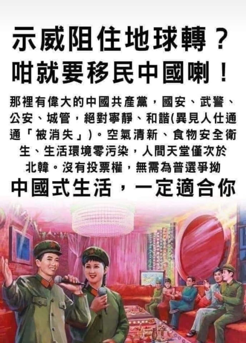 This graphic I was AirDropped, titled "Protests stop the Earth from from turning? We're all immigrating to China?" pokes fun at China's "all-powerful communism," "clean air," and "food safety." Another line says, "Heaven on earth, second only to North Korea."
