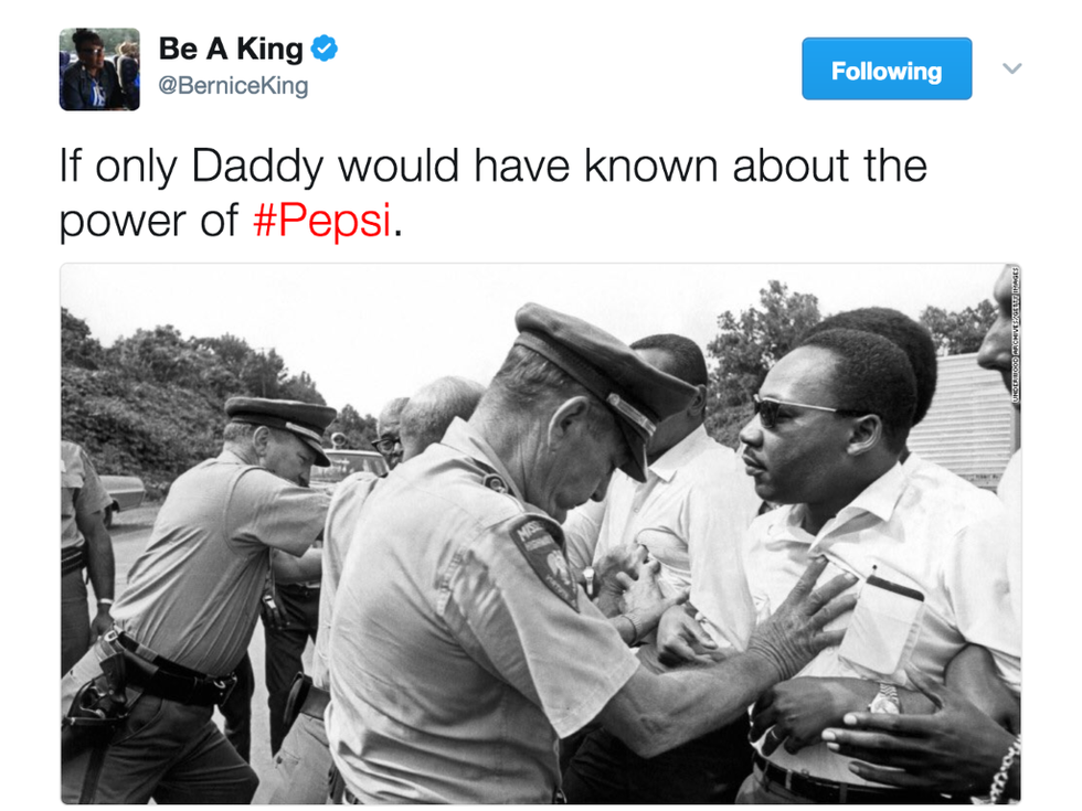 Suffice it to say, that the majority of the internet found the add to be a grossly transparent ploy to market to the youth and use the real, life-threatening work of actual activists to turn a profit. The outrage caused by the add is best encapsulated by this tweet from Bernice King, the last living child of MLK: