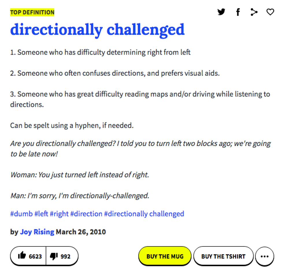 Fun fact about me, I was marked down for looking over the wrong shoulder when making lane changes during drivers ed. I blame that, however, on being extremely nervous rather than being directionally challenged. Which I also am.