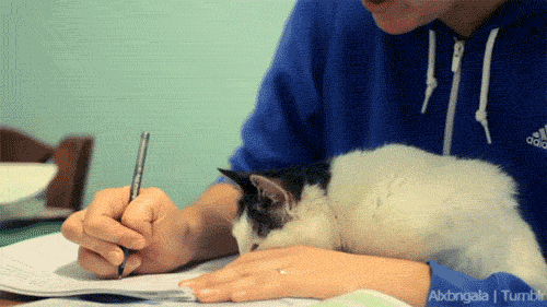 It seems that your cat knows you're trying to do something important. Without fail, they will plop down on your books or your computer so that you can't do anything productive without moving them...and they always get mad when you move them.