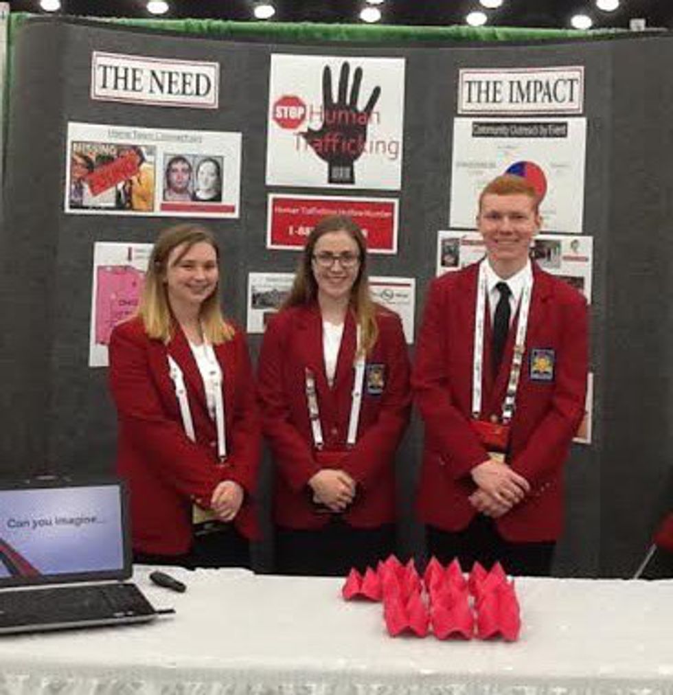 The trio spent weeks working on creating a powerful speech to deliver at local events, and on top of that, they spent hours cutting and folding a thousand paper fortune tellers containing facts about human trafficking. Upon perfecting their speech and visuals, they visited local basketball games on the high school and collegiate level to provide an informative half-time show. In our small town, they educated 1,533 community members. For Kaleigh, Bre and Zach this wasn't enough, so they decided to work harder and reach farther. They entered the SkillsUSA Heath Careers Pathway Showcase. This competition would allow them to present at state level, and upon winning, at nationals.