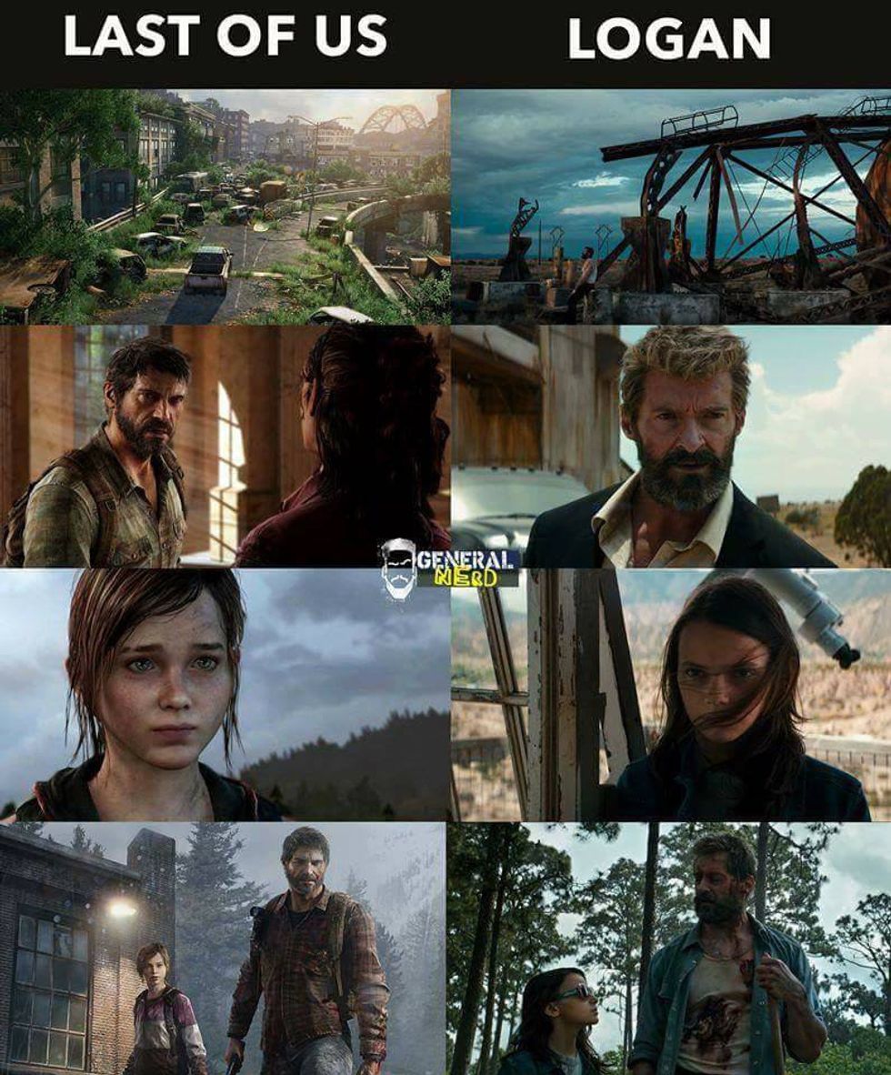 Since the movie is still relatively new, it is difficult to find actual pictures of the movie that aren't from the original trailer. Still, from the collage of snapshots from the movie and the picture that I used in the last point, it is VERY clear that the two pieces of content are quite similar visually. In parts of the movie that are not pictured in this article, any scene that takes place in woods in Logan is similar to the scenes that take place in wooded areas in The Last of Us. Also, the scene that takes place in the Munson's house is very similar to the scene in The Last of Us where Ellie escapes on one of Tommy's horses to a ranch. The houses are very similar in design (especially bedrooms).